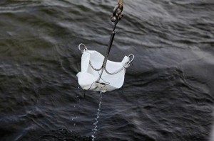 Stewart had on board another homemade method of capturing oil in the water column. He took two tomato cages and filled them with sorbent pad, layered it in plastic to hold it together, and left a hole at the bottom for the water to flow through, creating a large sorbent cone that could flow through the water.