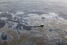 This photo taken Nov. 18, 2011 and released by Rio de Janeiro’s government, shows an aerial view of a boat crossing an area of the oil spill in an offshore field operated by Chevron at the Bacia de Campos, in Rio de Janeiro state, Brazil. Photographer: Rio de Janeiro’s government,Rogerio Santana/AP Photo