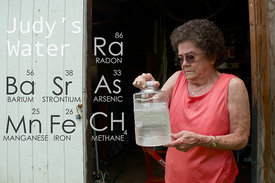 A resident holds up contaminated water from her well, located near a fracking site. (Photo: Public Herald)