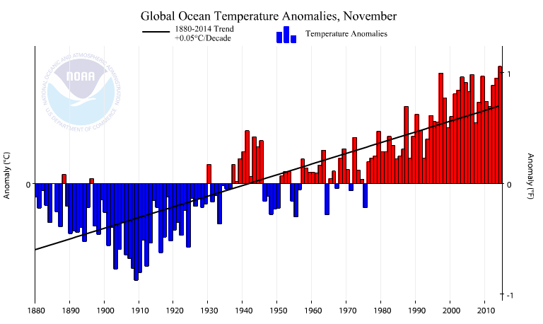 Global average ocean surface temperatures for the January through November period from 1880 to 2014, showing 2014 as the warmest such period on record. The solid line is the long-term linear trend.
