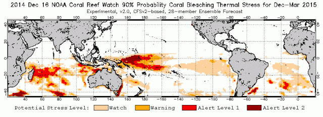Coral Reef Watch bleaching outlook for the winter, showing areas with a 90% likelihood of seeing some degree of bleaching.