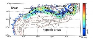 “We found three distinct hypoxic areas. One was near the Barataria and Terrebonne region off the Louisiana coast, the second was south of Marsh Island (also Louisiana) and the third was off the Galveston coast. We found no hypoxia in the 10 stations we visited east of the Mississippi delta.”